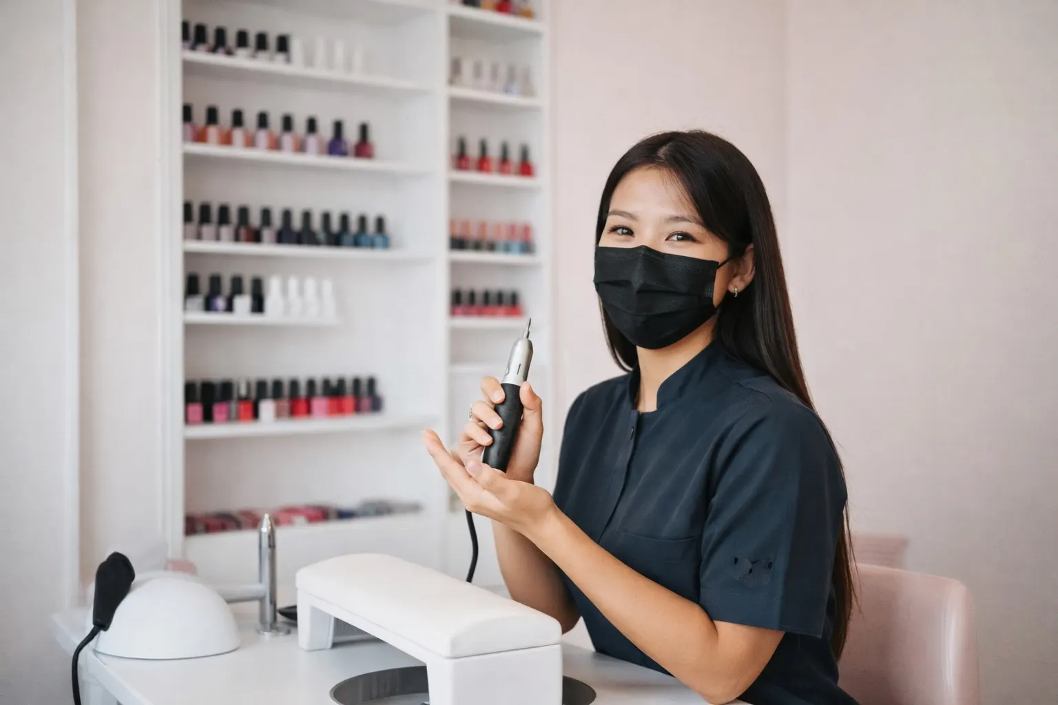 Jane Lin Nails at work with nail tools and polish display in the background